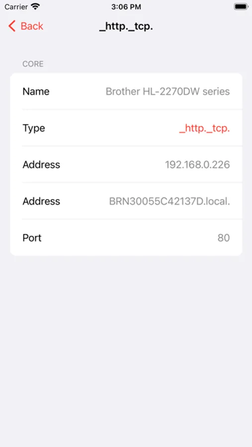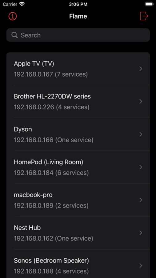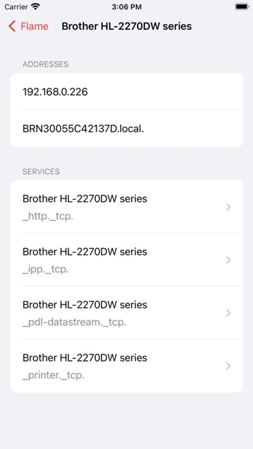 Flame is a browser for Bonjour (also known as ZeroConf) network services. It lists the services advertised on your wireless network and you can browse them by server. When selecting a service, its advertised details are displayed. You can copy any of the service details by long-pressing a row.