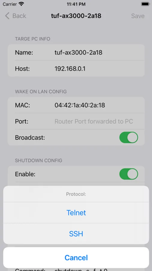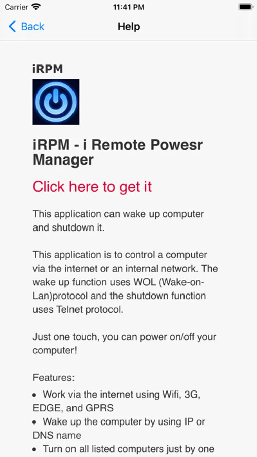 This application is to control a computer via the internet or an internal network. The wake up function uses WOL(Wake-on-Lan)protocol and the shutdown function uses Telnet protocol.