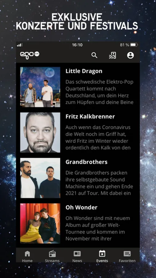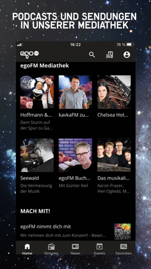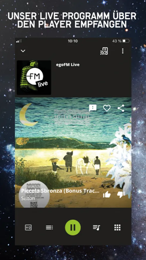 In our app you can discover new music far from the mainstream. In addition you get videos from the egoArtists, news, contributions for listening and discussion in one feed. Stay in contract with our moderators and send your message directly to the studio.