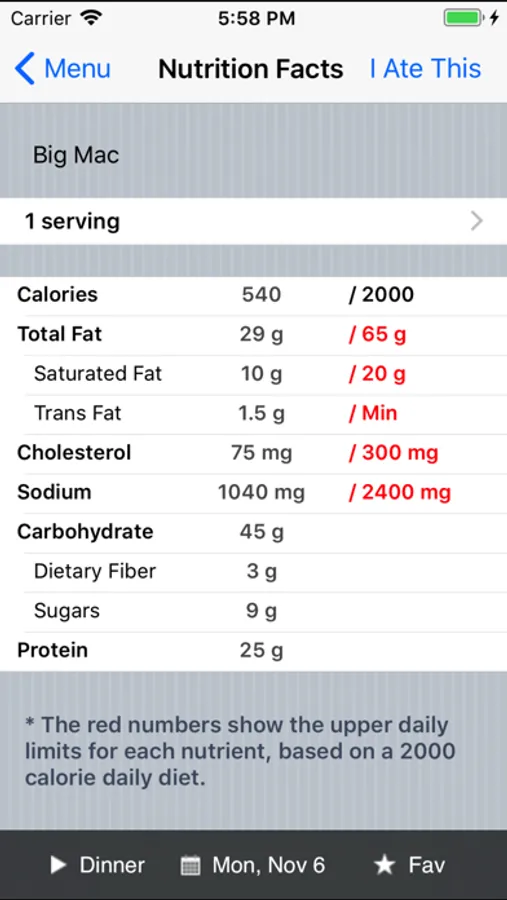 * Displays recommended upper limits for Total Fat, Saturated Fat, Trans Fat, Cholesterol, Sodium