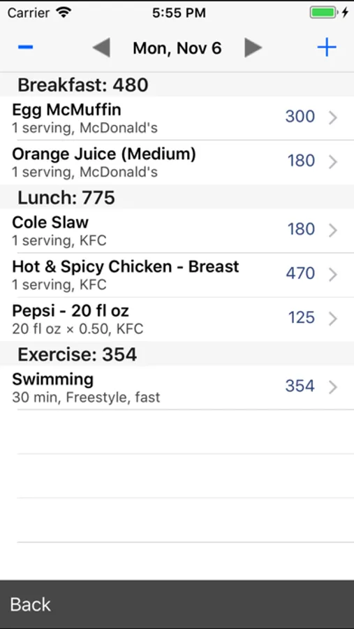 * Able to view average values of calories taken in, calories burned off, and other nutrients taken in for selected period