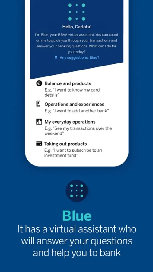 It is BBVA's virtual assistant. It allows you to consult the movements you have made, helps you in your daily management and solves any doubt related to your account. You can talk to it, for example, to consult your movements.