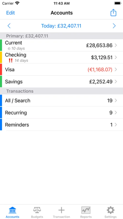 - Track multiple accounts: checking, current, savings, credit cards, loans/mortgages ... etc