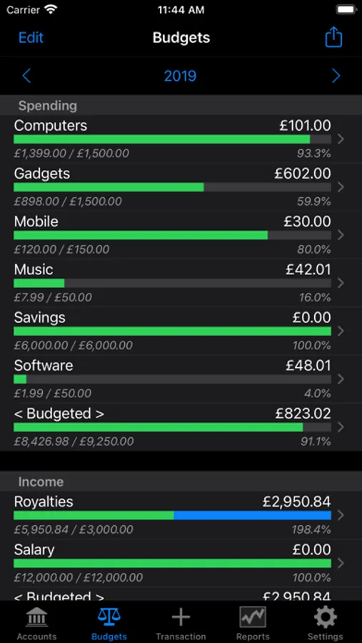 - Add budgets per category for spending, income and transfers across individual or multiple accounts