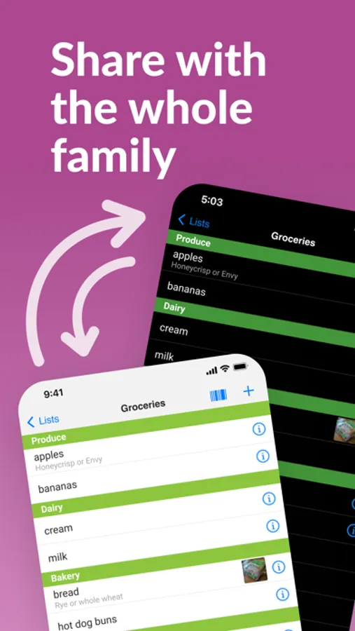 Every change to your shared shopping list is visible within seconds on any other iPhone, Watch, iPod touch, iPad, or other smartphone grouped with yours. See items being checked off as your partner shops!