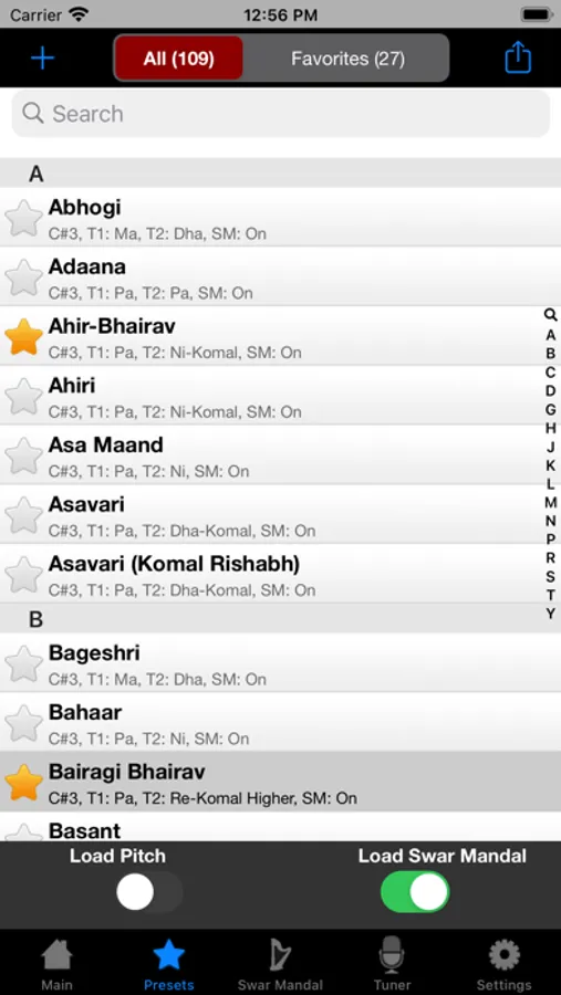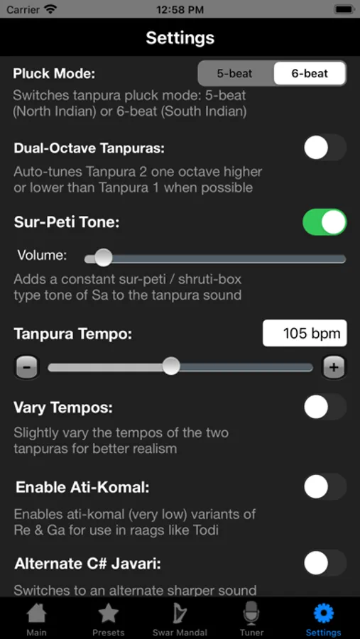 √ PRESETS: Save your favorite settings as named presets. Includes presets for the 100+ most popular raags. And now you can also export/import presets via email or iTunes File Sharing.