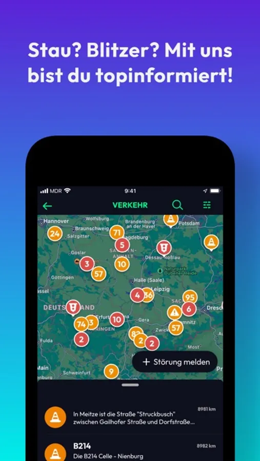 • Verkehr: Wir melden euch alle aktuellen Staus und Blitzer, Baustellen oder Störungen: Sowohl live auf einer Karte, als auch nach Autobahnen sortiert. Du hast selbst einen Stau oder Blitzer entdeckt? Dann melde ihn direkt aus der App.
