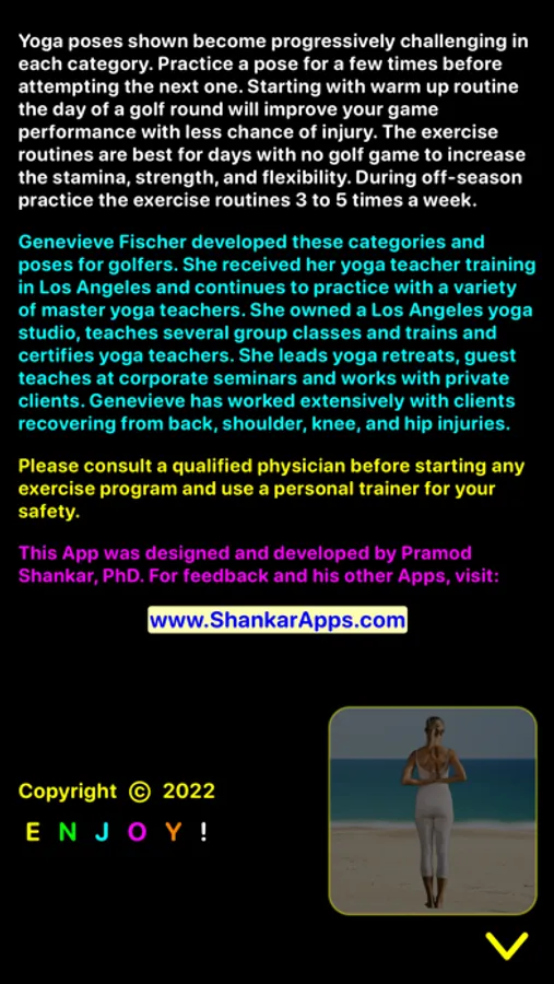 In a busy world people try to do too much in a short period of time that often leads to injury. Oh, if only there was a way that they could exercise, regain focus, and help their emotional and physical well being all at the same time. Now, with Golf Yoga this has become a reality. This informational App is a handy instruction guide for avid golfers who would like to improve their health as well as their golf score.
