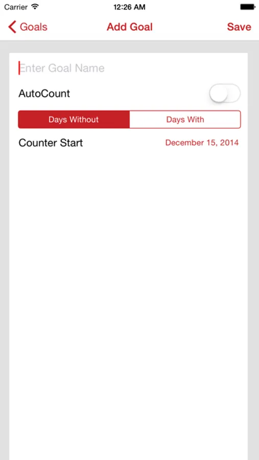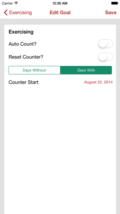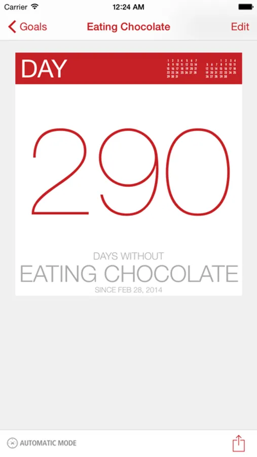 - Choose from Manual or Automatic mode (the app will automatically keep track of your Days Without a goal)