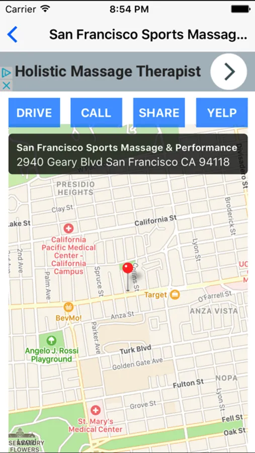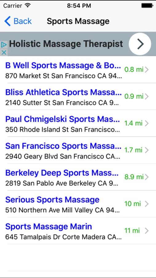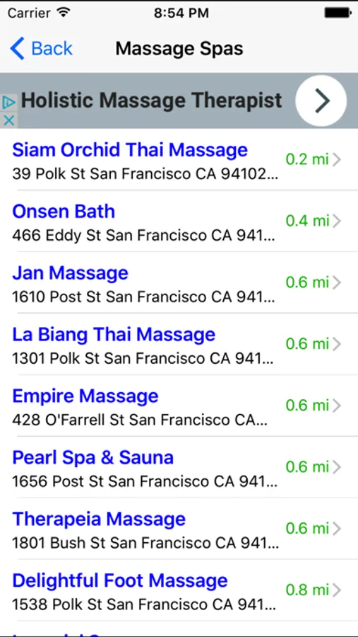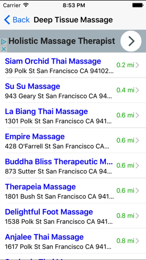 When you select a listing, you can see the massage therapist's exact location on the map, his or her address, telephone number, and the distance from where you are. You can also call the massage therapist directly by tapping on the phone icon on your iPhone.