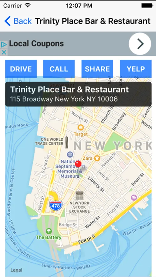 When you select a listing, you can see the business location on the map, the address, telephone number, and the distance from where you are. You can call the business directly by tapping on the phone icon on your iPhone.