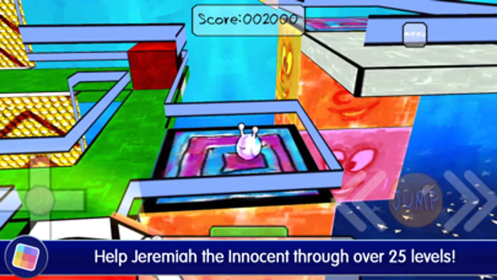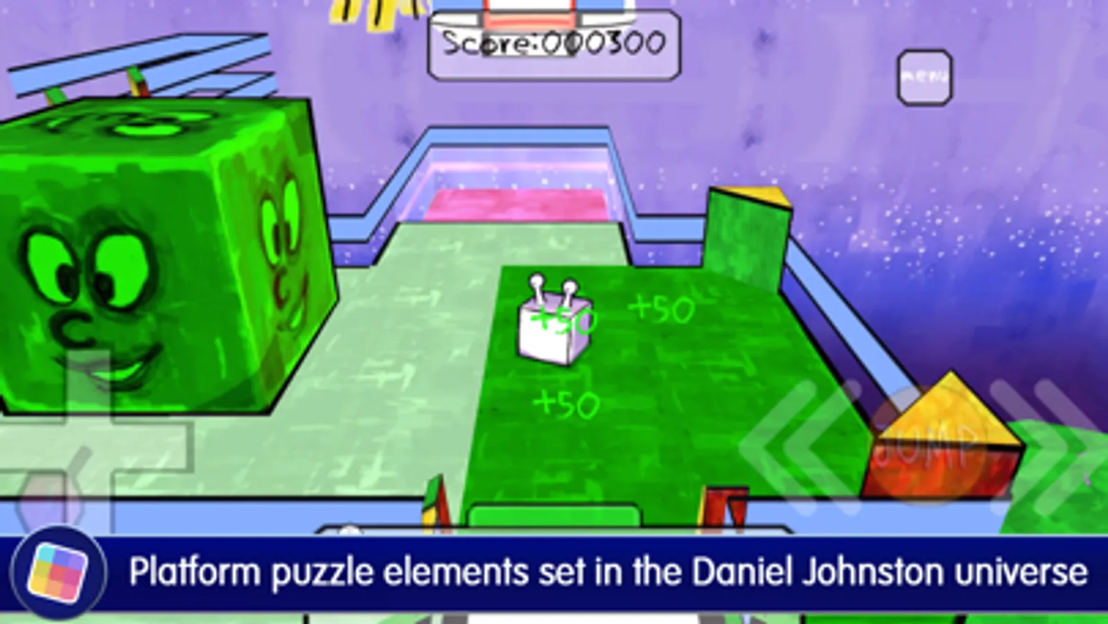 Hi, How Are You is a 3D platformer based on the art and music of the late Daniel Johnston, and starring his well-known character, Jerimiah the Innocent. Jerimiah has been transformed into a frog by an evil force and must reverse the curse to rescue the love of his life. Help him regain his true form by outrunning, outsmarting, and outmaneuvering his enemies through increasingly tough obstacles in a bizarre, otherworldly universe. It's not enough just to find the exit — Jerimiah has to hop on every green square in the stage to open the way forward, and each labyrinthine level contains special bonus squares as well. With 40 different stages and 4 different forms, you've got your work cut out for you!