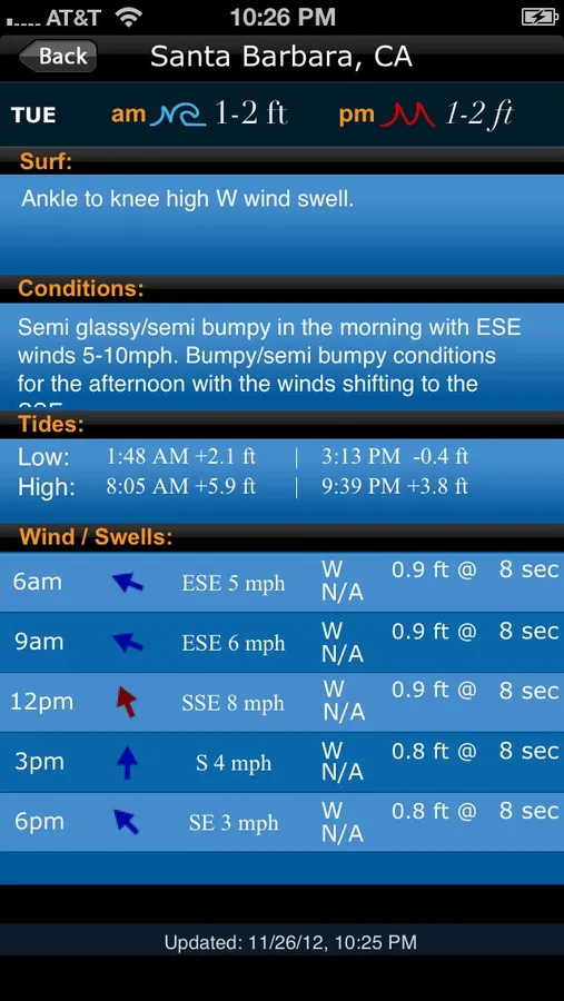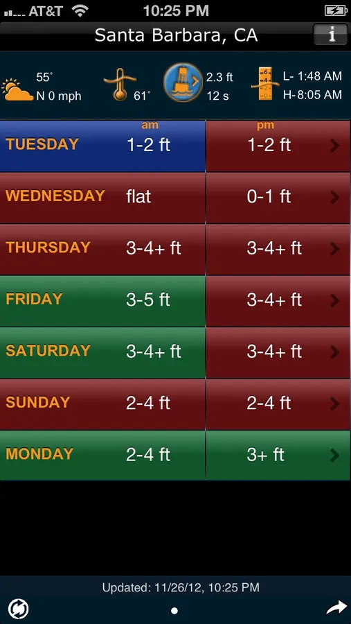 Launching Swell Info brings you to the main forecast screen providing a summary forecast for the morning and afternoon for each of the 7 days, conveniently color coded using green (clean), blue (fair), and red (choppy). You can swipe back and forth between your 5 favorite locations, and when you want the details, you can click on each day to get the detailed text surf forecast, tides, and hourly wind and swell data. The Swell Info app, also includes current wind, weather, tides, and buoy data, updated hourly at the top of each main forecast screen. This is the crucial information that notifies you on what the surfing conditions are right now - what the tide is doing, whether the sea breeze has kicked in, or if the new swell has started to show on the nearest buoy station.