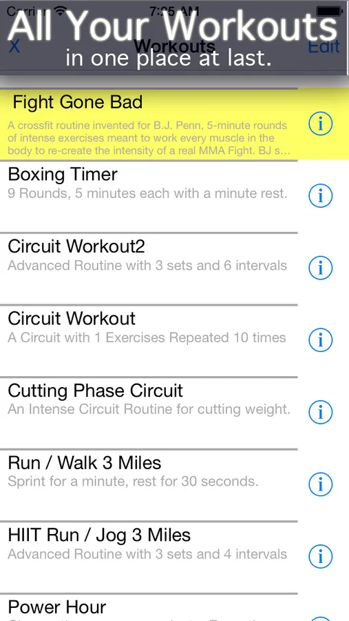 One More Round comes with several great workout routines preloaded including HIIT routines, circuits, a tabata routine, and B.J. Penn’s classic Crossfit routine “Fight Gone Bad”.