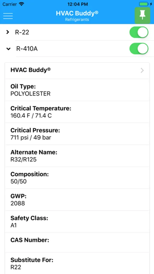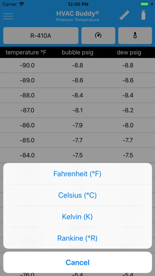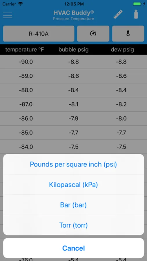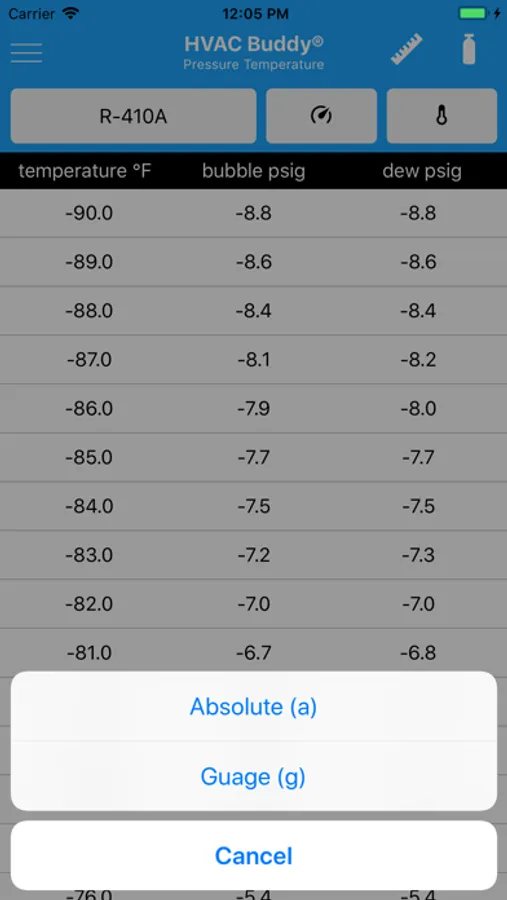 HVAC PT Buddy contains Pressure Temperature relationships for over 100 refrigerants in both Metric and English units in one degree increments. All refrigerant blends have bubble and dew points on the same line. To better indicate temperature glide R404a, R407c, and R410a show both temperatures for the same pressure on one line. For most of the current common refrigerants you can also view several additional thermodynamic properties enthalpy, entropy, specific heat, etc. Each refrigerant has chemical name, boiling point, critical pressure, critical temperature.