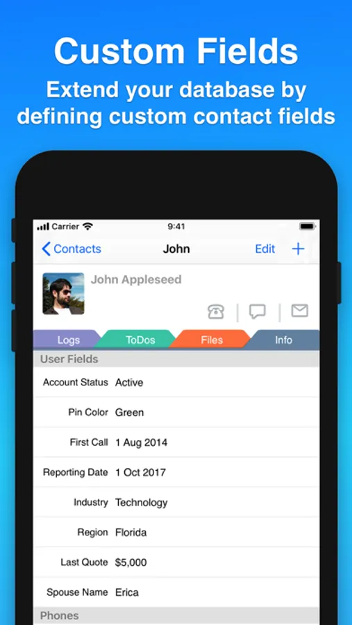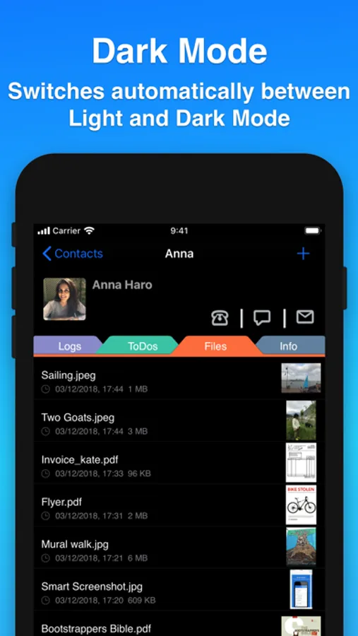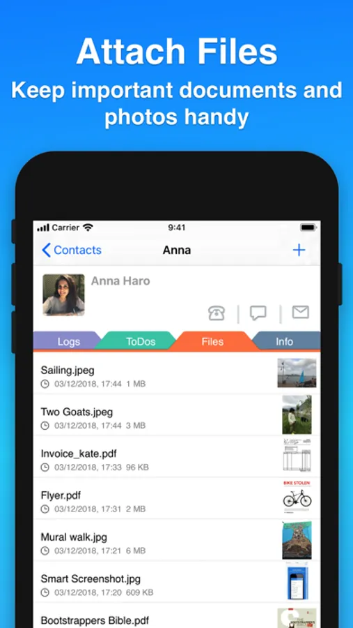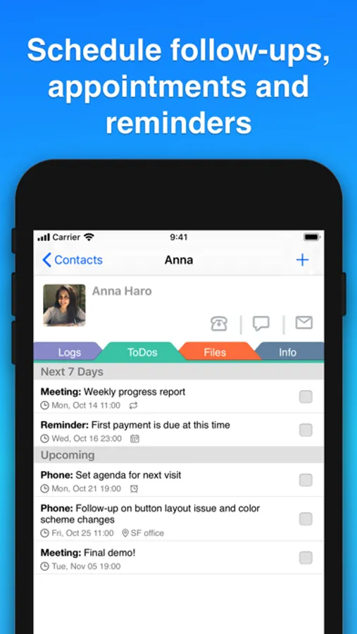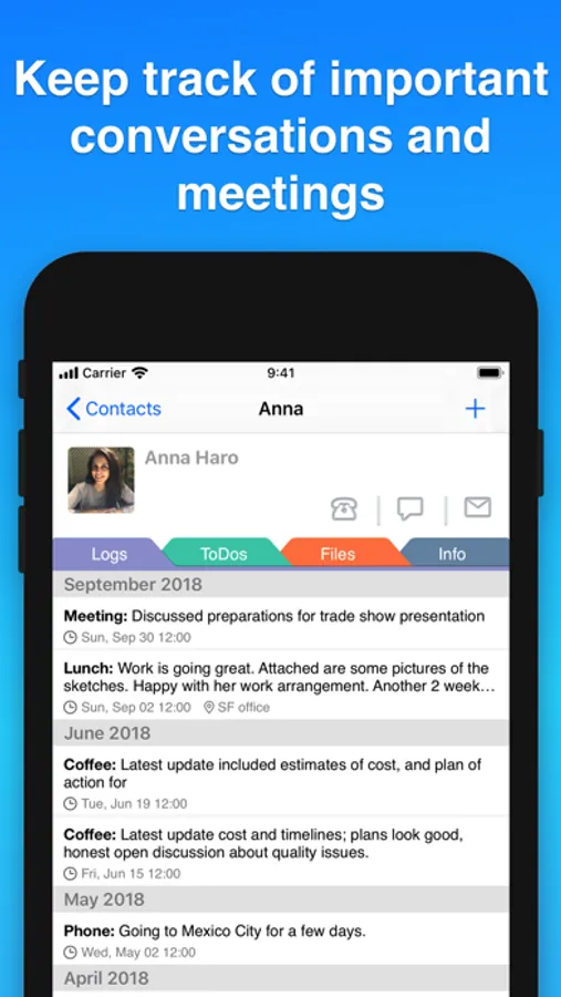 Keep notes for each meeting with Logs; create follow-ups and reminders with ToDos; attach images and documents with Files