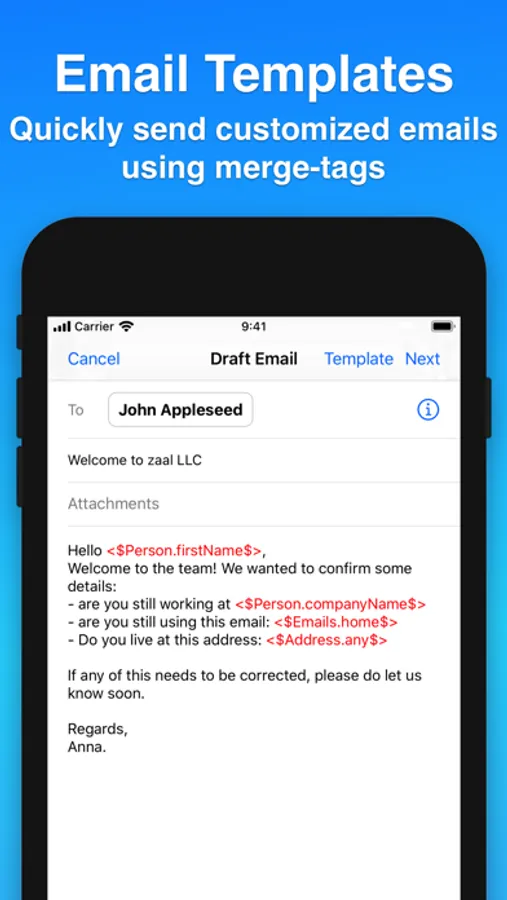 Create email templates with personalization tags, to send prepared emails quickly, but with a personal touch