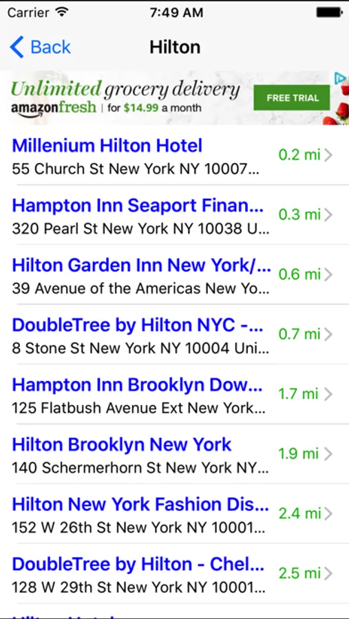 When you select a listing, you can see the hotel's location on the map, the address, telephone number, and the distance from where you are. You can also call the hotel directly by tapping on the phone icon on your iPhone.