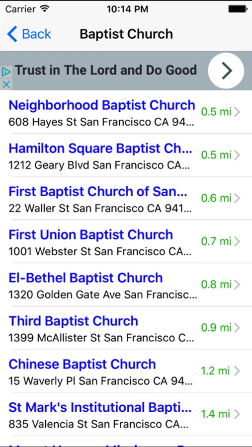 When you select a listing, you can see the church's location on the map, the address, telephone number, and the distance from where you are. You can also call the church directly by tapping on the phone icon on your iPhone.