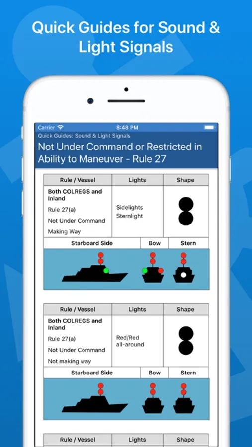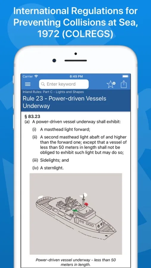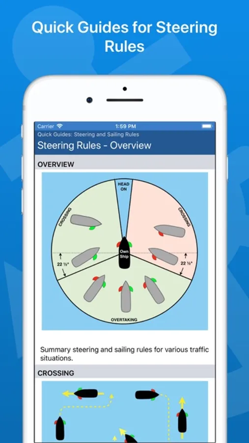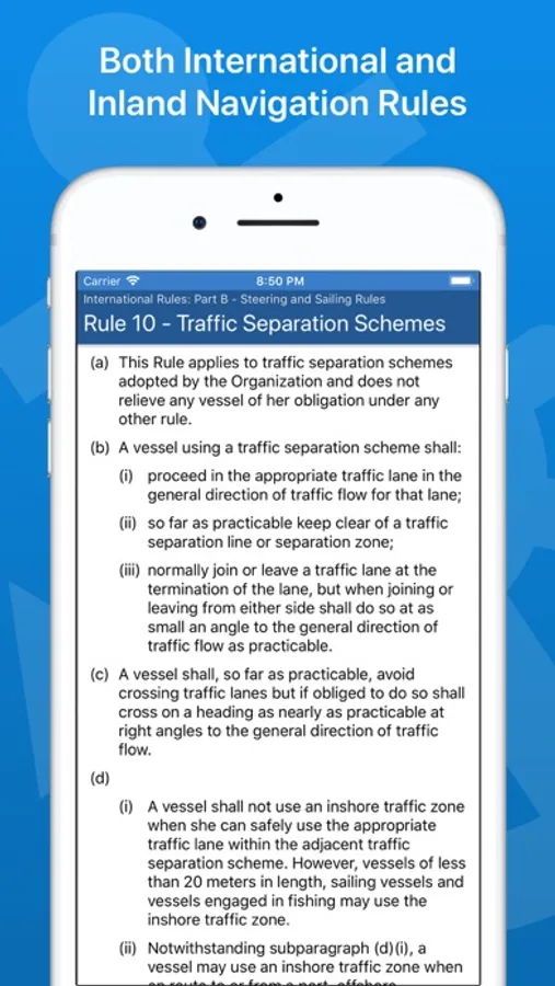 Navigation Rules contains a complete copy of the International Regulations for Preventing Collisions at Sea, 1972 (COLREGS), including amendments and the Inland Navigation Rules, in effect for all inland waters, including the Great Lakes. App is COLREGs most recent version dated - June 28th, 2019.