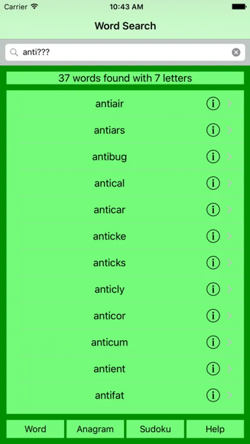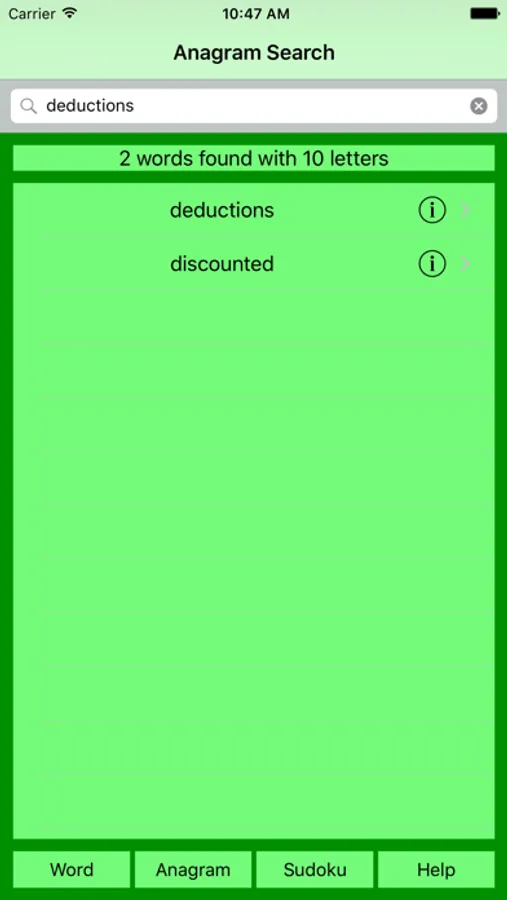 To solve anagrams tap the button at the bottom of the screen. Now you are in anagram mode, and as before you may tap the searchbar to display the keyboard and then use the keyboard to enter the letters in the anagram. The results are displayed as before.