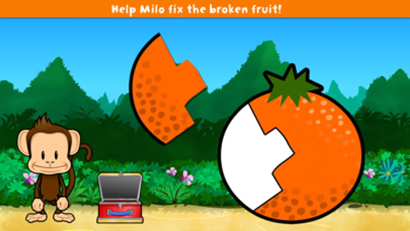 5. PUZZLE. This monkey's fruit broke into pieces! How odd! Put it back together for them. Teaches shapes and pattern recognition.