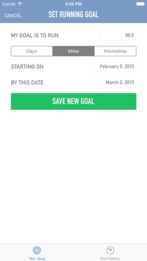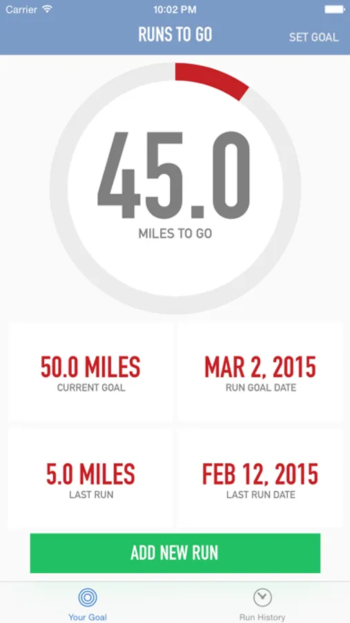 Each time you complete your run, simply enter the number of miles or kilometres you ran, and Runs To Go will show you how far you've got left on your goal.