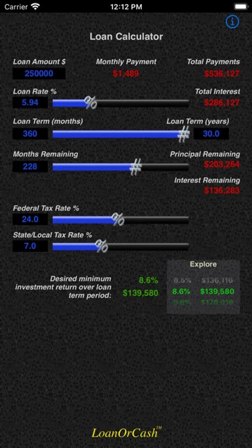 This application helps you explore fixed-rate loan scenarios for both new or existing loans. For existing loans, this application will calculate the remaining principle and interest on the loan. “Loan or Pay Cash?”, is a unique feature which can provide insight to a common financial planning question on whether to borrow money or pay cash for a purchase? Or assist with deciding whether to pay off an existing loan with cash from savings or investments.