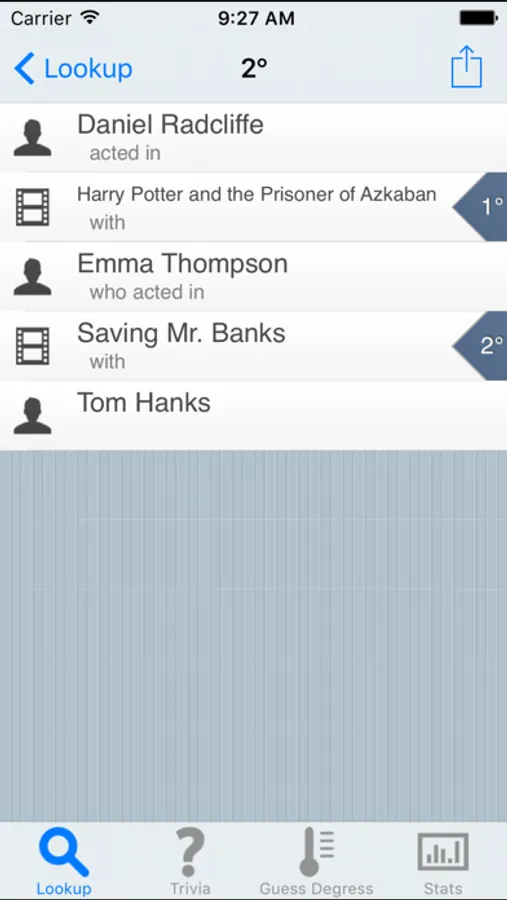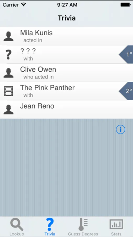 • Trivia: An incomplete list of actors and films is given and you must select the correct answer to complete the degrees of separation.