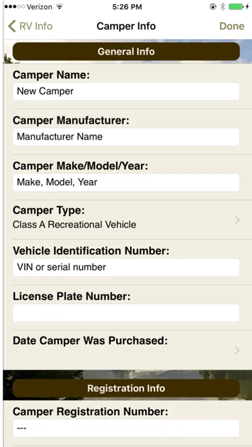 RV INFO: Keep important RV information in one easy to find place. Record data like specifications, registration numbers, inspection expiration date, camper length (great for site registration), dealer contacts, service center info, insurance info, replacement tire type, etc. Also track information for a tow or pull-behind vehicle. Track scheduled and past RV maintenance and even generate an emailable report.