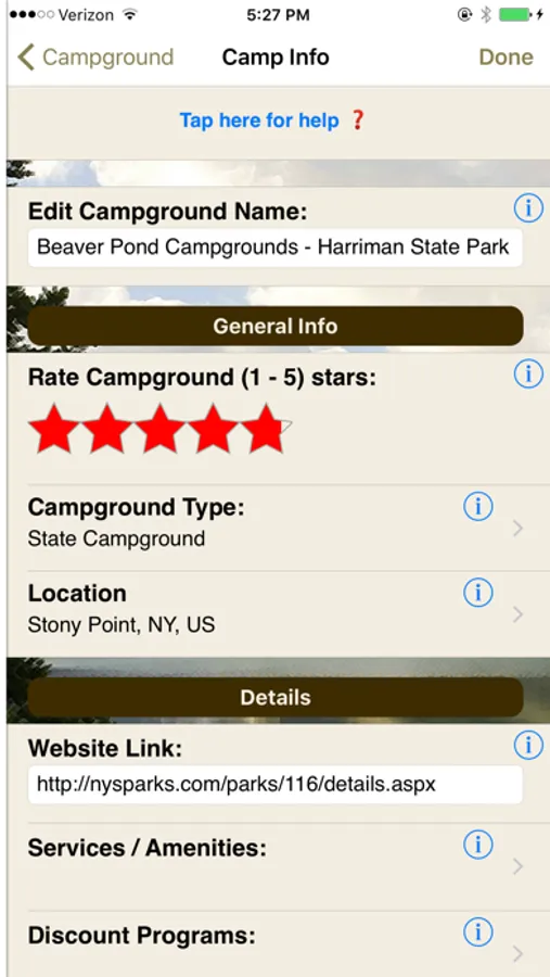 CAMPGROUNDS: Record campground information like services, near-by attractions, and contact information. Link contacts to your address book. Rate campgrounds from 0 to 5 stars for future reference and sorting. Track specific camp sites that have been visited and track potential sites for future visits. Sites can be rated as well. View and enter trip log information for each visit to the campground for future reference.