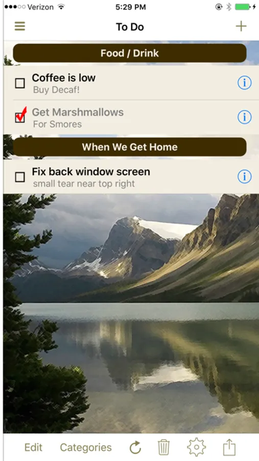 TO DO: Quickly enter needed supplies as you think of them or run out of them while camping. Also track to do items for the camper, like stuff to fix. Entries are grouped by categories and a quick check-off list for easy shopping is provided. A great tool to keep all of your RV related info in one place between trips. Never loose that supply list again or leave it in the camper!
