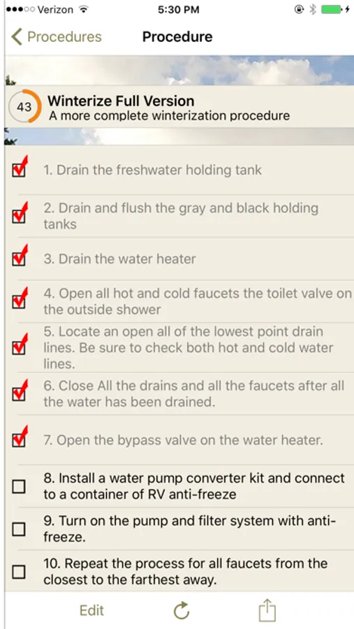 PROCEDURES: Keep all procedure lists in one place like winterizing the camper, last minute items to check before leaving the house, etc. Never have to track down a camper manual again by creating procedures in the RV Companion.