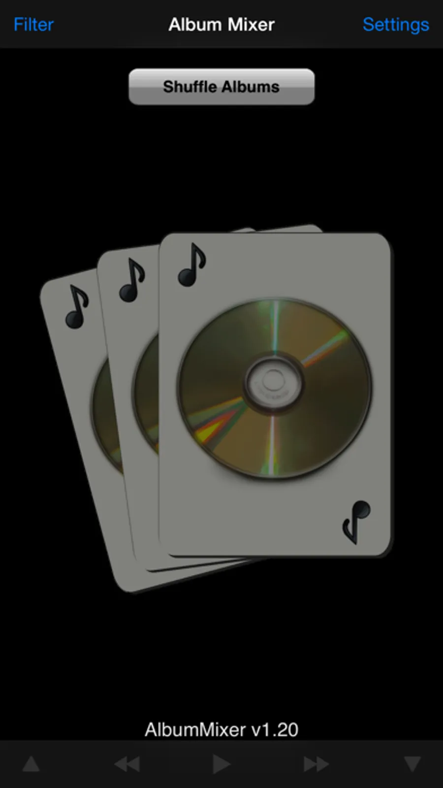 If the album now playing has album art, AlbumMixer will display it. Otherwise you will see the album title and artist. You can use the bottom toolbar to pause, skip to the next track, or skip to the next album. You can also rewind to the previous track or album.