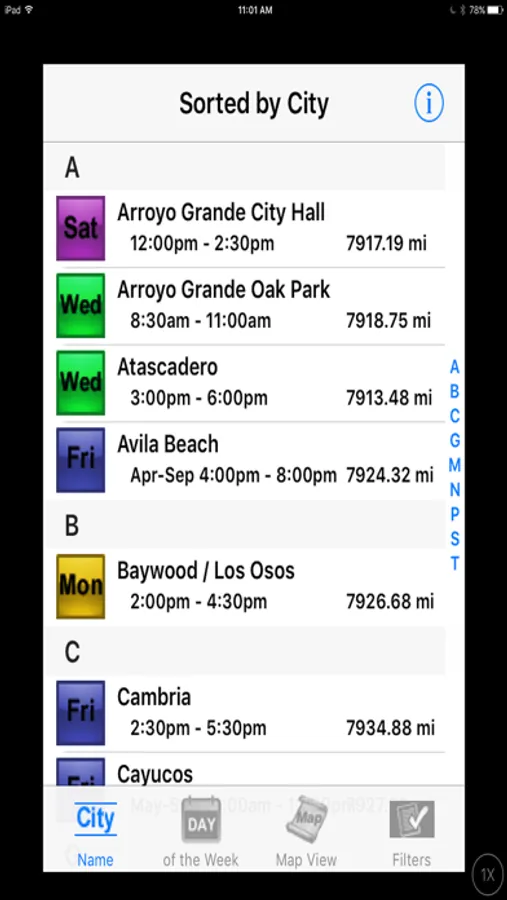- The data can be sorted in a table view either alphabetically by city or by Day of the week and distance from your location