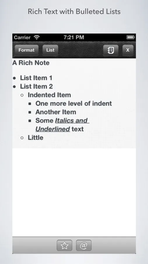 Support for text formatting (Bold,Italic,Underline,Strikethrough) and Lists within notes (numbered, unnumbered, indent, outdent), insert pictures (iPad only).