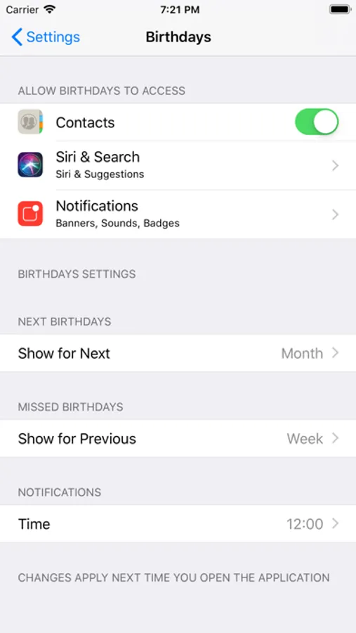 Open the iPhone's or iPod's "Settings" and scroll down to the Birthday Reminders entry to configure all the options.