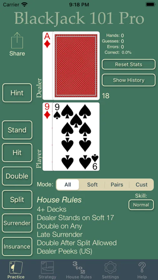 Blackjack 101 allows you to adjust the playing rules to match conditions commonly found in casinos, including the number of decks in the shoe, the dealer's action on a soft 17, doubling rules, and surrender. It also allows you to focus your training on the trickier hands: pairs and soft hands. Plus it has both a left- and right-handed layout, to make it easy to play with one hand or two.