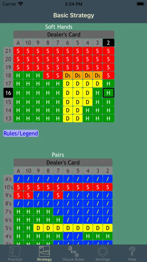 - Four learning modes: random hands, soft hands, pairs, and a new Custom mode: choose any combination of hands to practice.