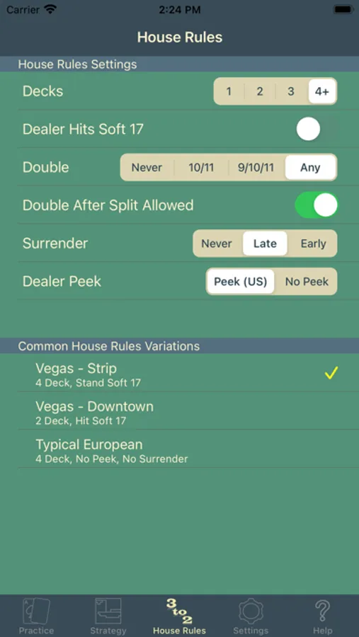 - Many different rule configurations (1-4 decks, dealer hits/stays on soft 17, double after split, early/late surrender)