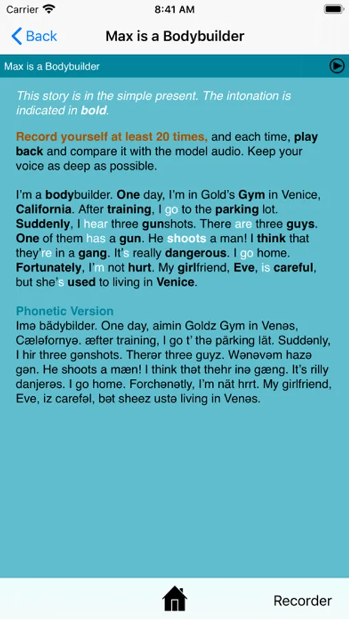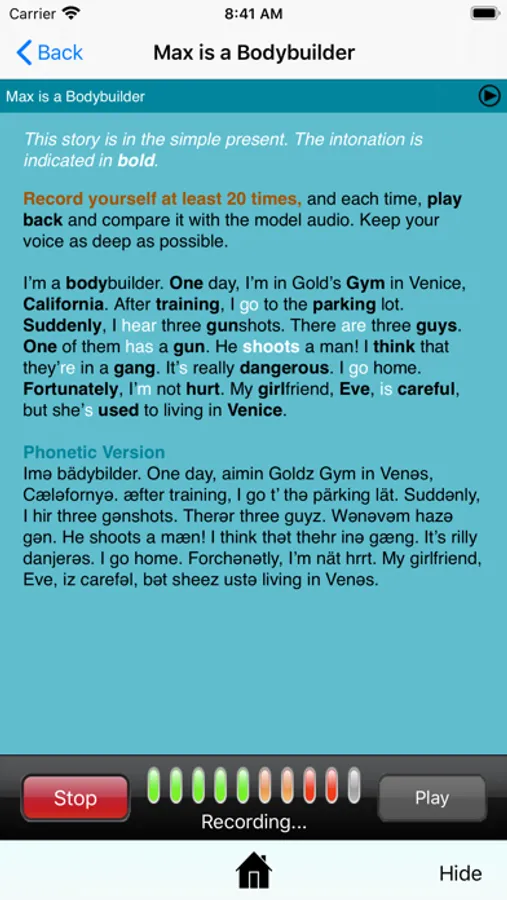 This is the story of Max, an Italian bodybuilder who visits America for a while. He gets into all kinds of trouble, meets a lot of people, and generally has a great time. It is a series of nine vignettes, each with text and audio. The text is both regular and phonetic, with the intonation marked in bold so you can see the stress points and hear them in the audio. There is audio for all text and a recorder on every screen so you can record yourself and compare your voice with the model audio.