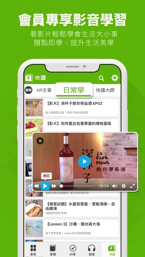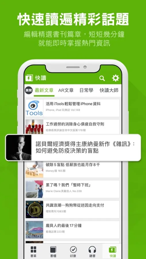 不受時間、空間限制的隨身電子書閱讀服務,讓您隨時隨地利用零碎時間充電學習,提供多元型態閱讀,包含報紙/雜誌原版面閱讀、有聲書閱讀、聽書、快讀大師影音導讀、日常學影音課程,立刻掌握最新趨勢!