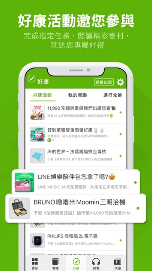 可從「書單」瀏覽各種報紙、雜誌、書籍清單;使用「書櫃」管理及閱讀下載的刊物;進入「好康」參與活動及獎勵;利用「快讀」迅速閱讀文章精華;「聽書」功能以耳朵聽書,隨時聆聽!