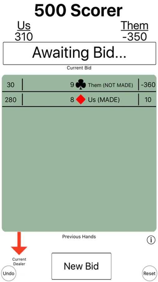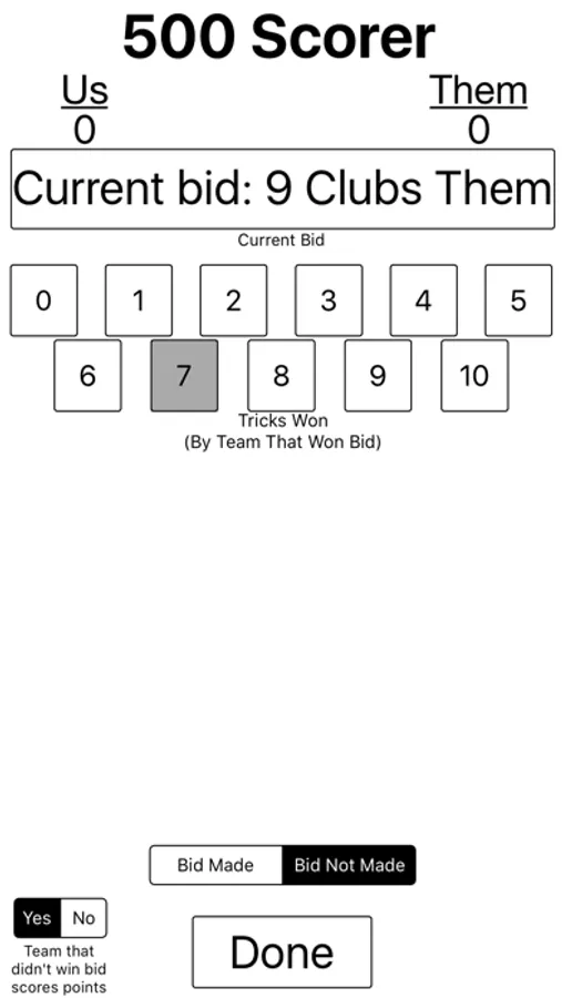 500 Scorer helps you score the card game 500. Simply enter in the winning bid and the number of tricks taken and 500 Scorer takes care of the rest! It couldn't be simpler!