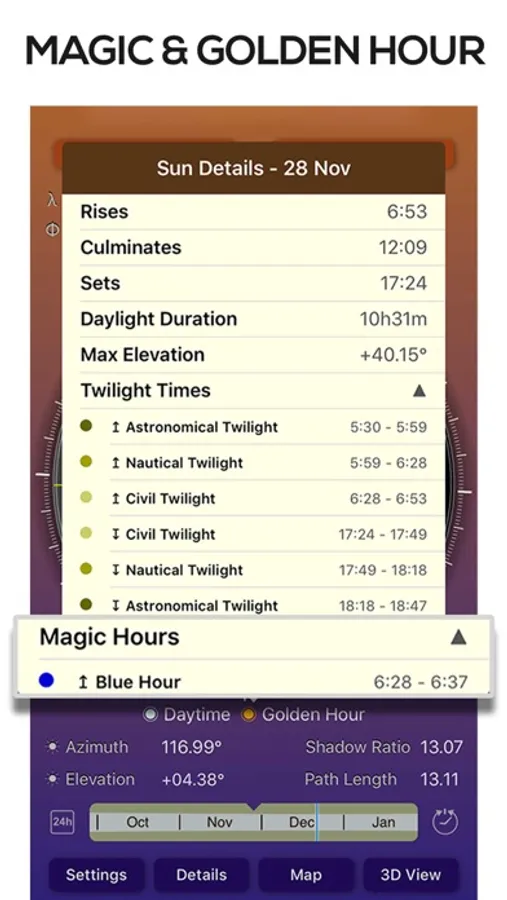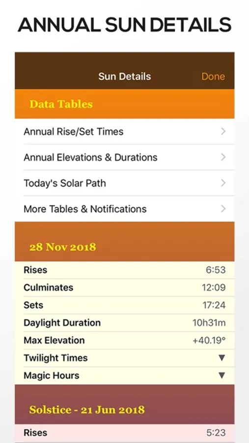 * Get additional details including sun rise, sunset & culmination times, maximum elevation, civil, nautical & astronomical twilight times of the sun.