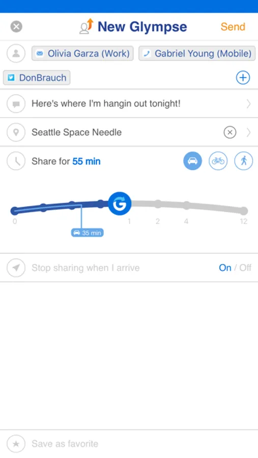Send a Glympse to let friends and family know you are on your way. Request a Glympse from a colleague who is always running late. Set up a Glympse group for your family reunion.