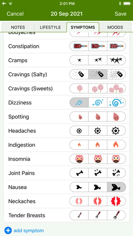* Take daily notes of menstrual symptoms including Spotting, Flow, Cramps, Headaches, Backaches, Bloating, Tender Breasts, and Body Aches!