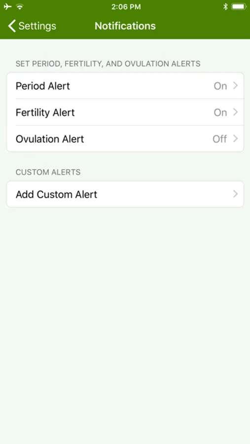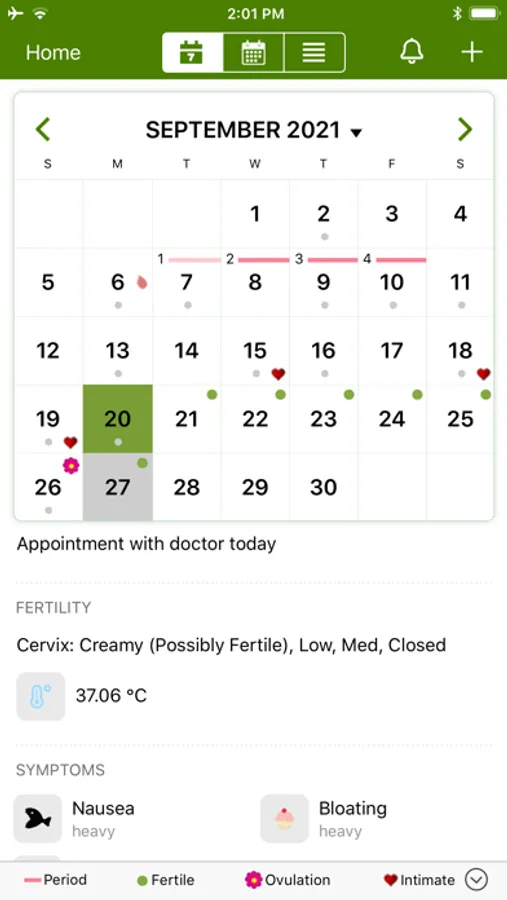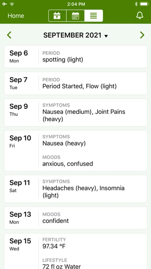 * View your current and future period dates, ovulation and fertile days, moods, symptoms, weight, temp, and fertility notes in a simple month-view calendar.