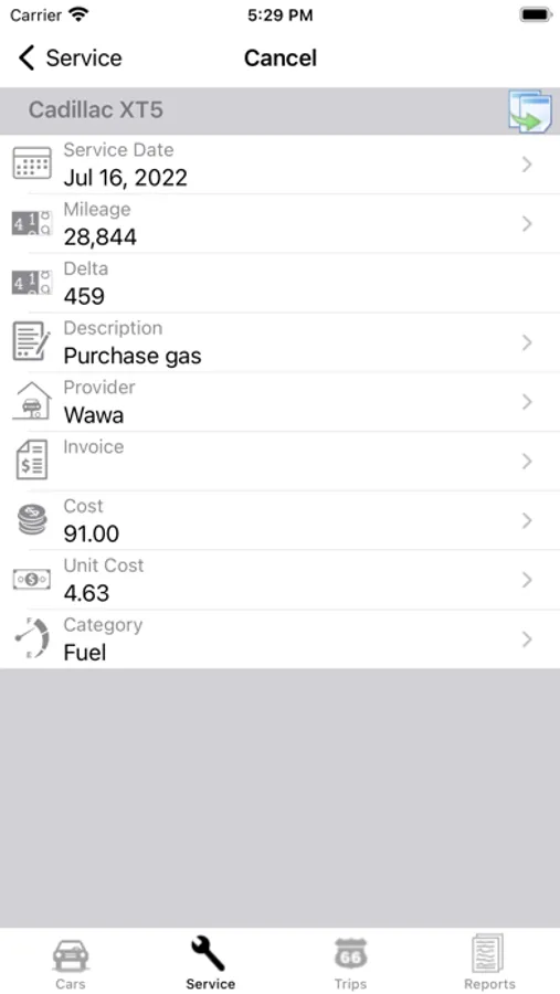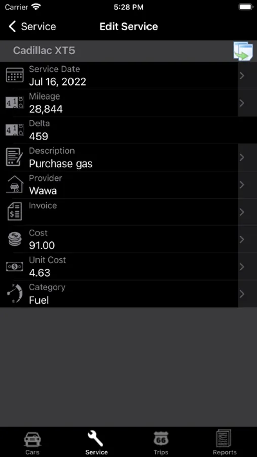 •Service category (Fuel, Maintenance, Oil Change, Supplies, Parts)