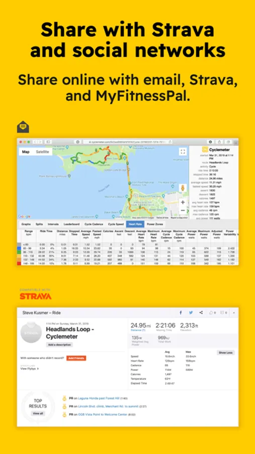 - Share by email, Strava, or MyFitnessPal
